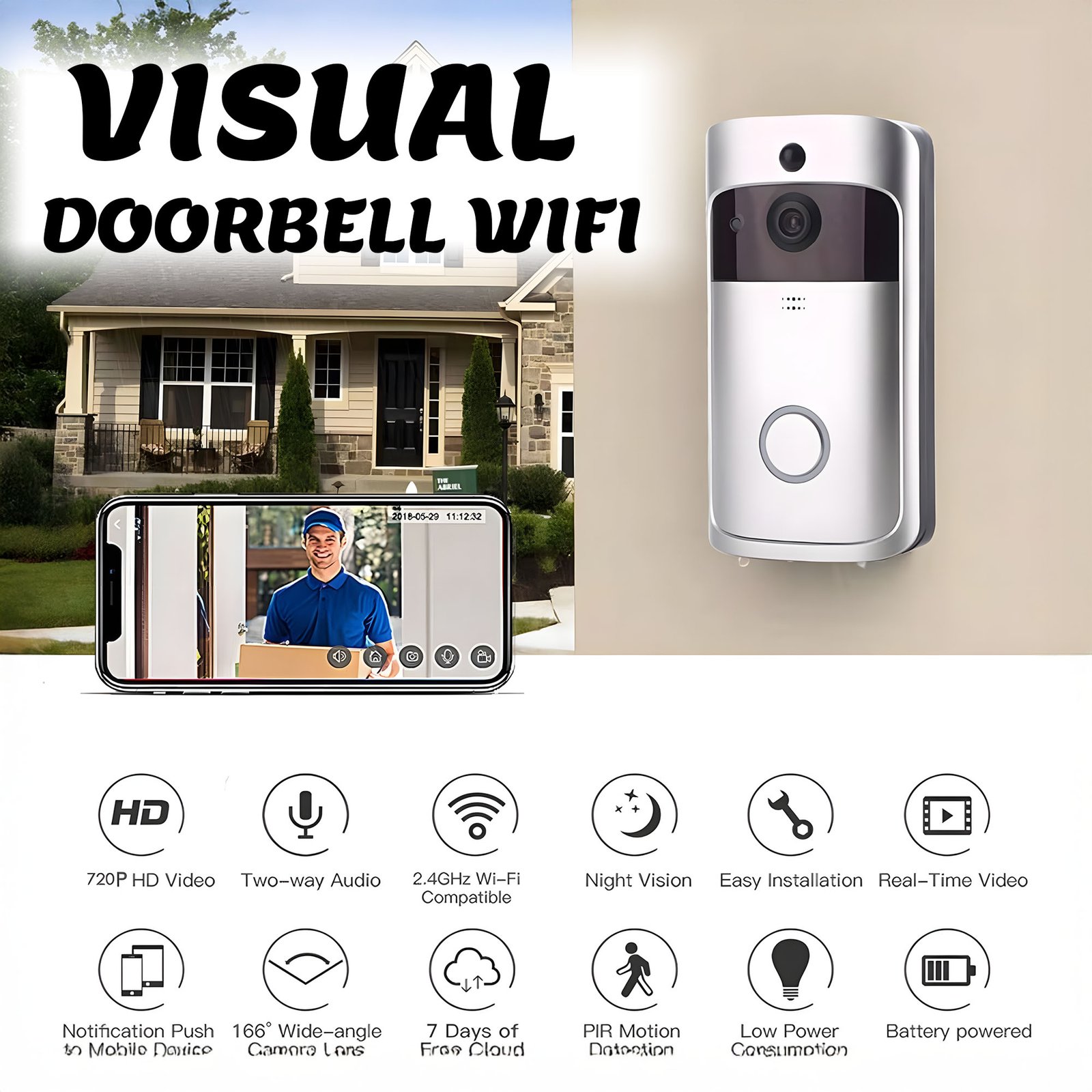 + Free Shipping“خلك دايمًا على علم بمن يطرق بابك، حتى لو ما كنت فالبيت! جرس الباب الذكي Visual Doorbell WiFi يعطيك راحة بال وأمان فكل وقت ومكان. 🏡📱”راحة بالك تبدأ من باب بيتك! 📹🔔