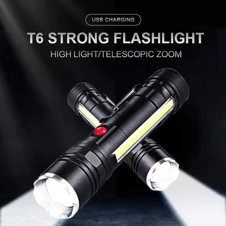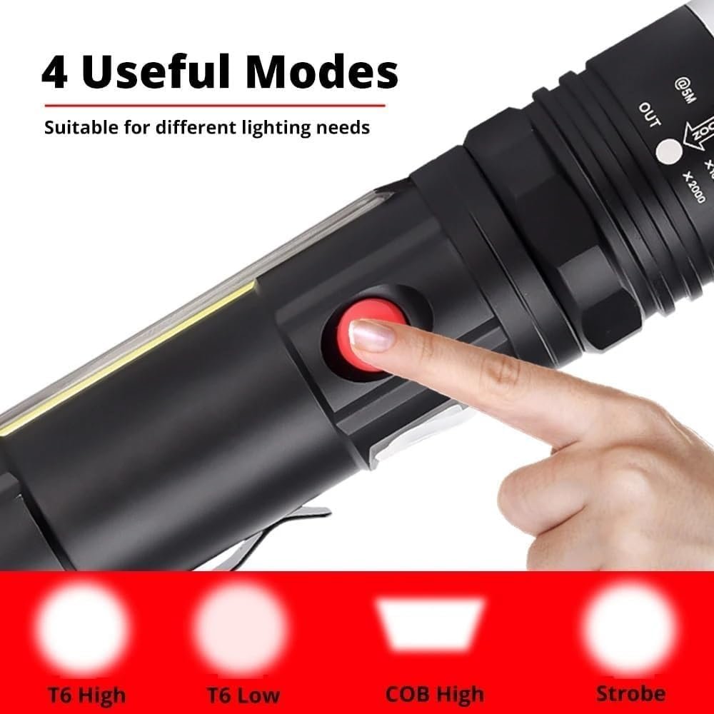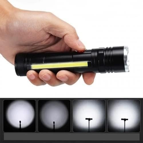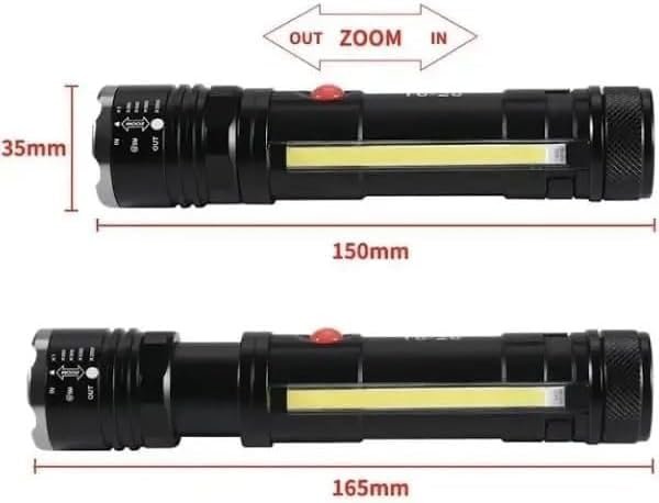 الكشاف فيه لمبة COB جانبية بتنور مساحة واسعة، ممتازة للشغل، التخييم، الصيانة، أو أي استخدام محتاج إضاءة ثابتة وعريضة.